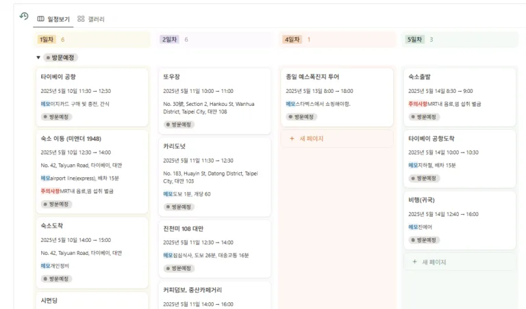 1일차 ~ 5일차까지 구분된거 보이시나요? ‘날짜’속성 외에, 1~5일차로 구분된 ‘날짜태그’ 속성을 새로 추가했습니다. 그 후 ‘날짜태그’로 그룹화를 하여 여행 일자별로 일정을 구분되어 볼 수 있게 표시했습니다. 또한 ‘날짜’ 오름차순 정렬을 통해 첫 일정이 위로 오도록 구성했습니다.